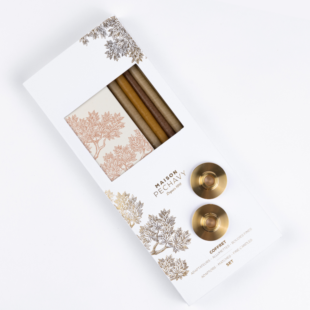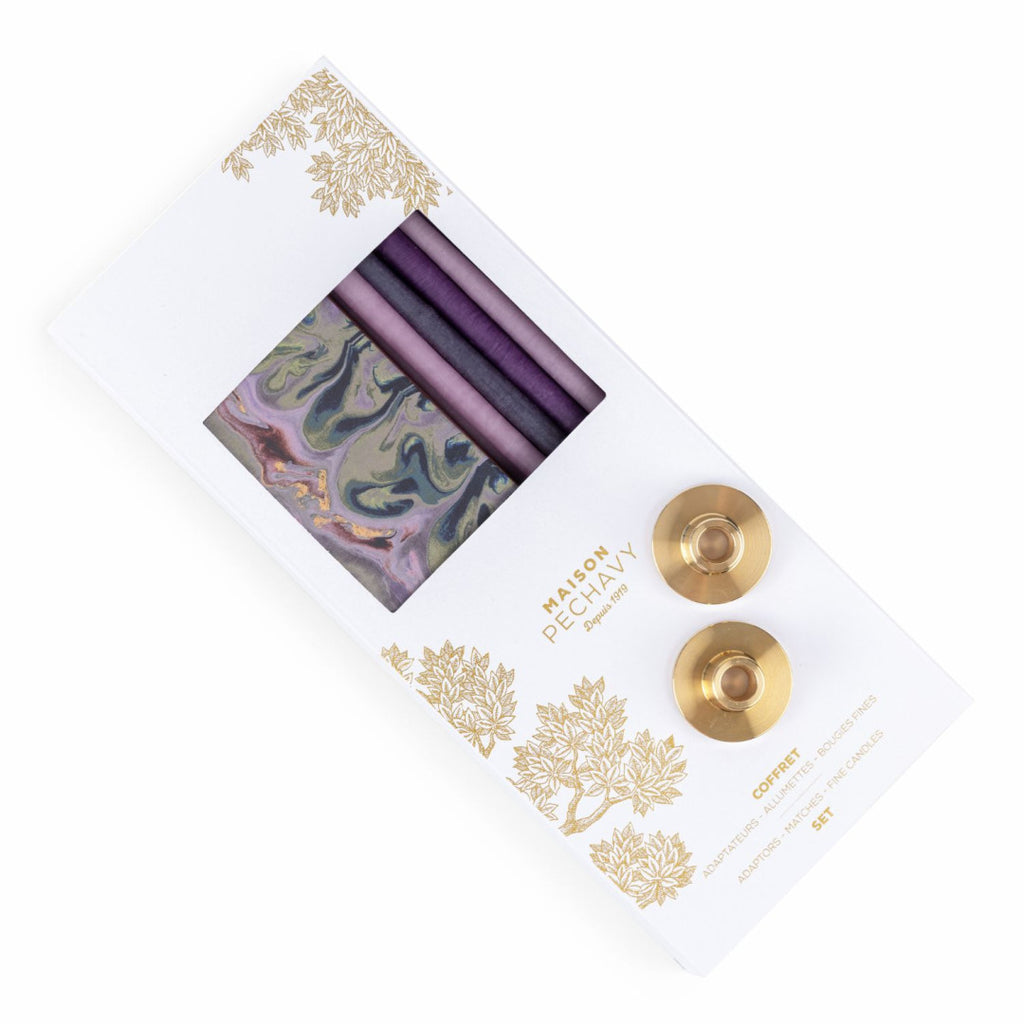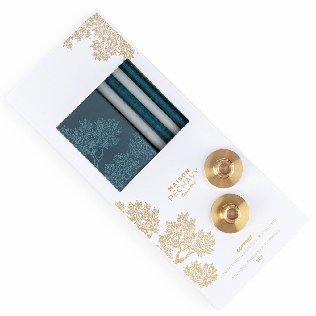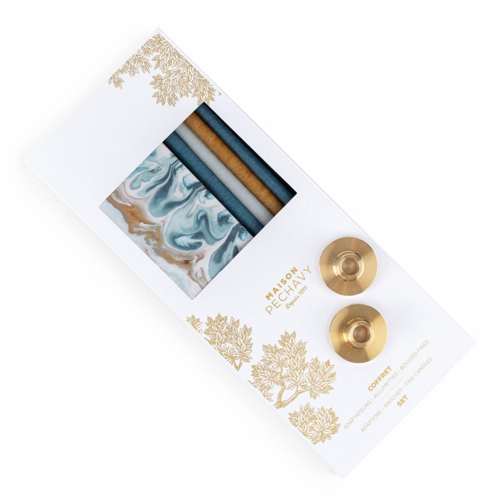 Entdecken Sie die elegante Geschenkbox mit 10 handgefertigten Kerzen, zwei Messing-Kerzenhaltern und einer passenden Streichholzschachtel – das perfekte Geschenk für alle Deko-Liebhaber.