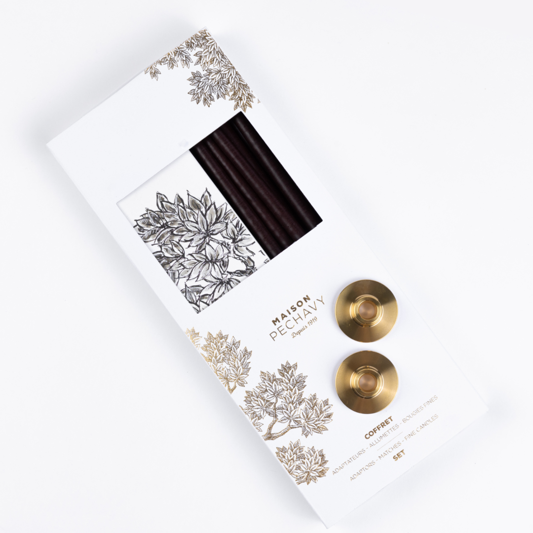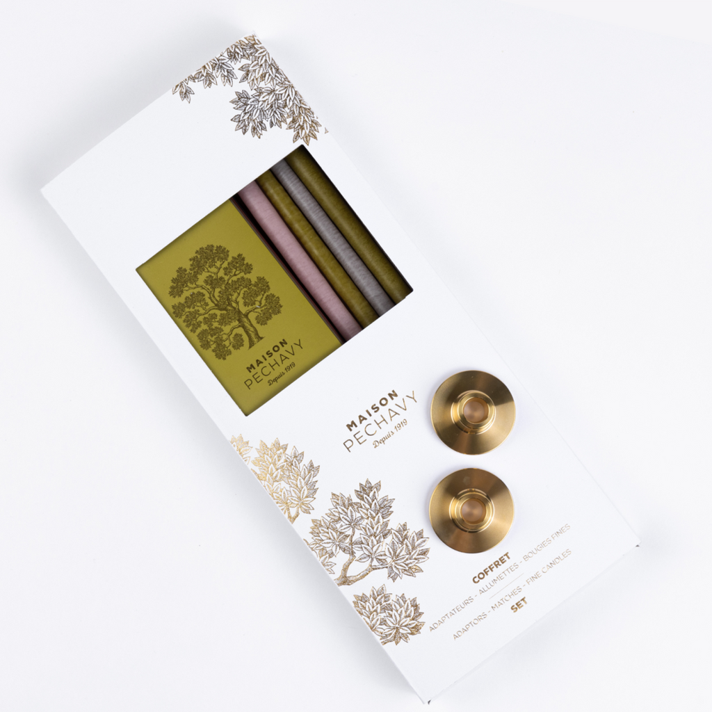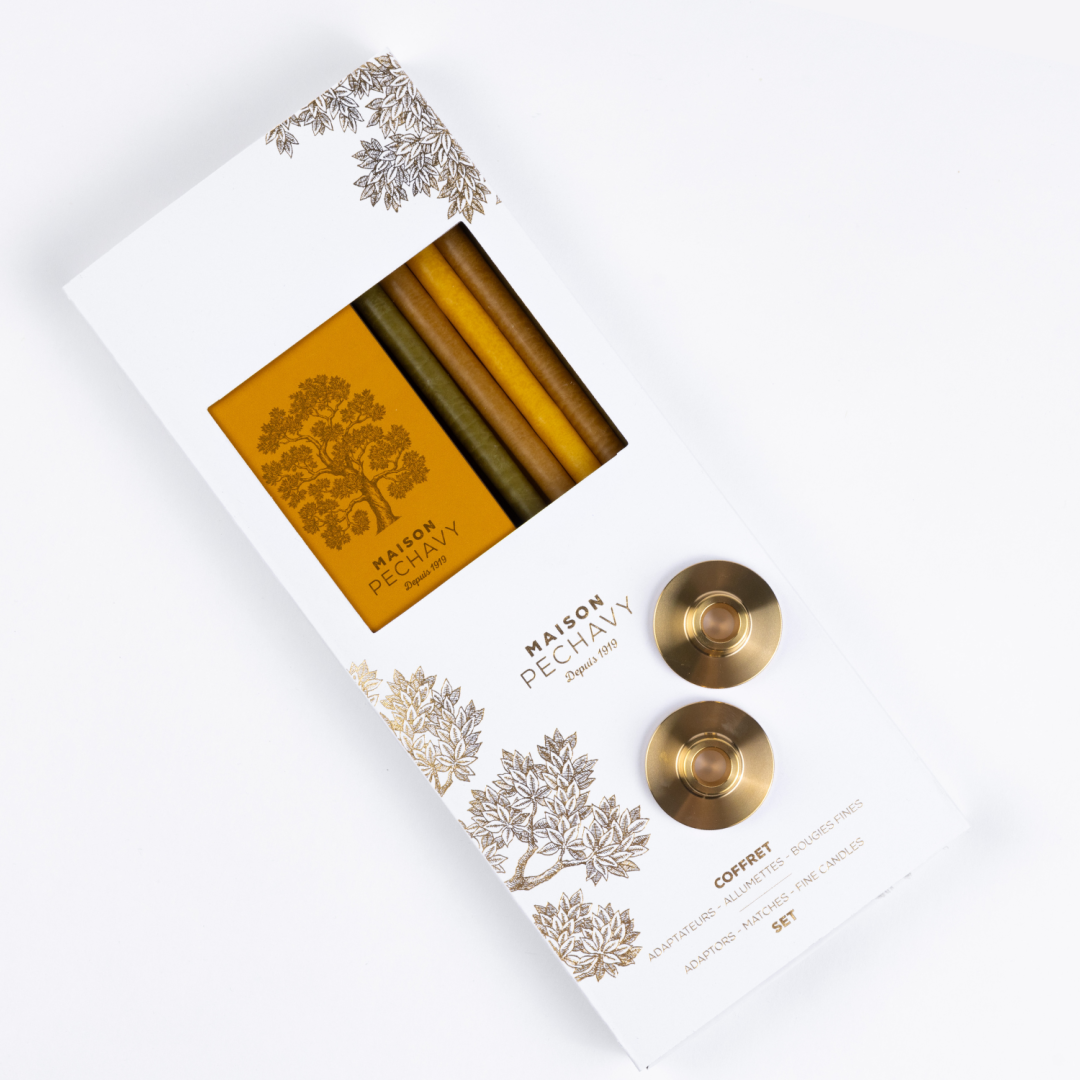 Entdecken Sie die elegante Geschenkbox mit 10 handgefertigten Kerzen, zwei Messing-Kerzenhaltern und einer passenden Streichholzschachtel – das perfekte Geschenk für alle Deko-Liebhaber.