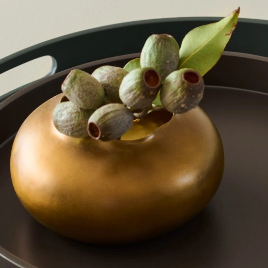 Wunderschöne handgefertigte Messingvase, 15 cm Durchmesser und 8 cm hoch, in hellbrauner Patina. Einzigartige Details aus traditionellen Handwerkstechniken.