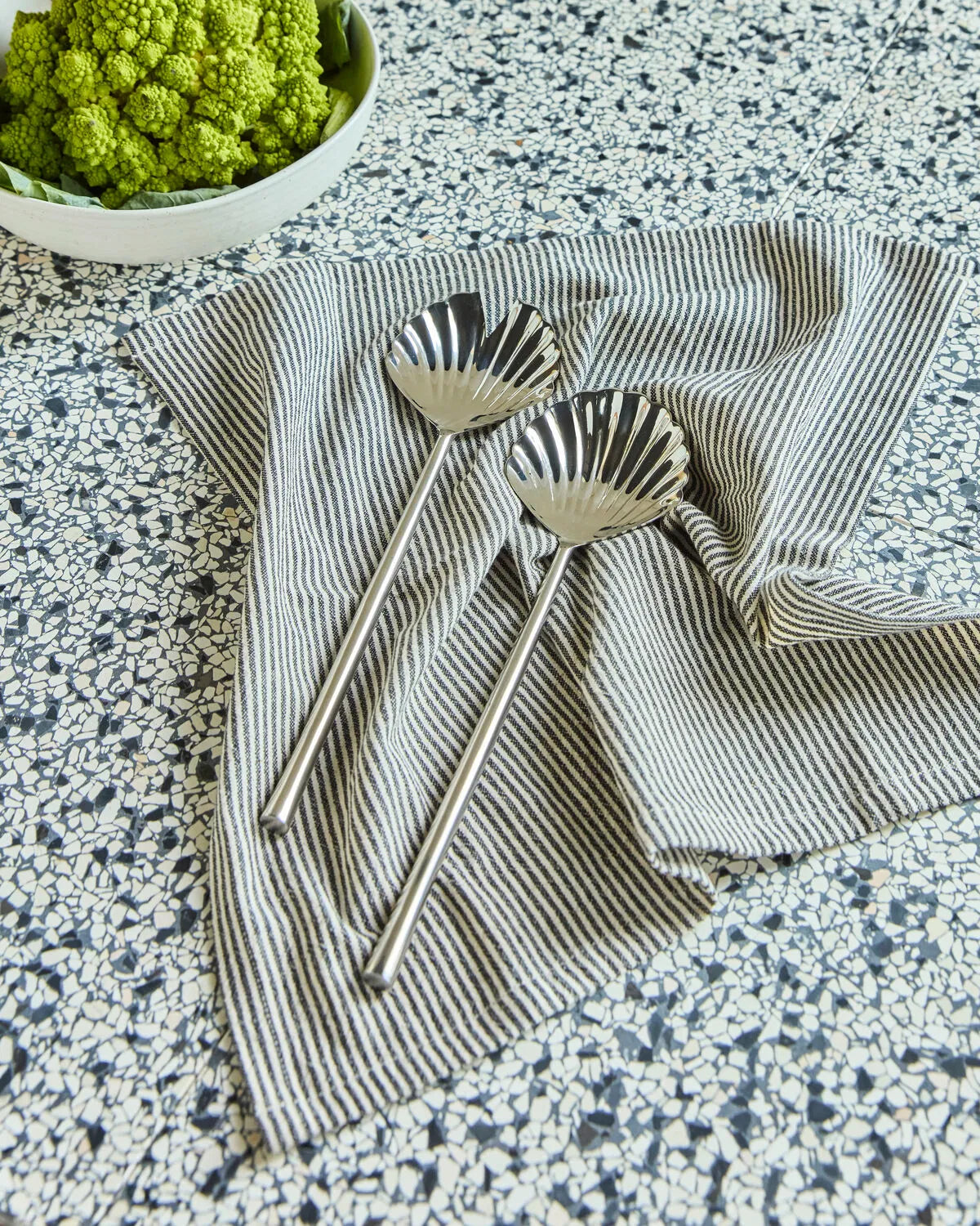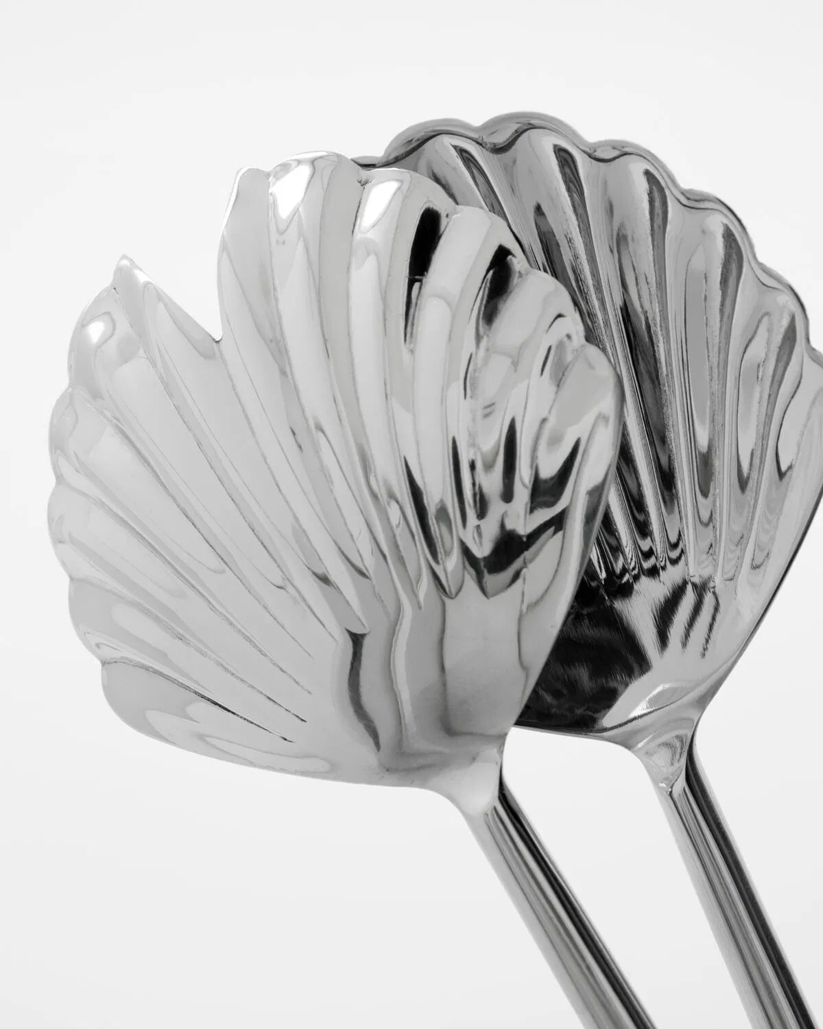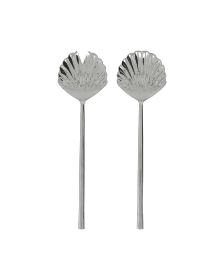 Set aus zwei Salatbestecken aus Edelstahl mit muschelförmigen Köpfen. Das skulpturale Design sorgt für einen eleganten, dekorativen Ausdruck.