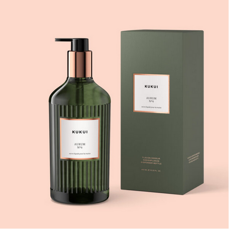 Der stilvolle Glasspender ist inspiriert von der puristischen Form der KUKUI Raumduftflakons. Ergänzend ist dieser veredelt mit aussergewöhnlichen Rillen, welche das Flakon zum Eyecatcher machen. Die smaragdgrüne Farbe holt die Natur ins Interieur. Die Pumpe in schwarz und roségold rundet den edlen Look ab.