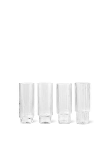 Mit ihrer welligen Oberfläche kanalisieren die mundgeblasenen Gläser ein anspruchsvolles Gefühl, was die Longdrinkgläser der Serie zu einem natürlichen Element eines gemütlichen Abends in guter Gesellschaft macht. Individuell gestaltete geometrische Formen machen das Fundament der dynamischen Glasserie aus, die gleichzeitig ästhetisch und funktionell ist. Schenken Sie ihr Favoritengetränk in die Gläser ein, und sehen Sie wie ein schillerndes Spiel des Lichts und der Struktur in den Wellen der Gläser auftaucht.