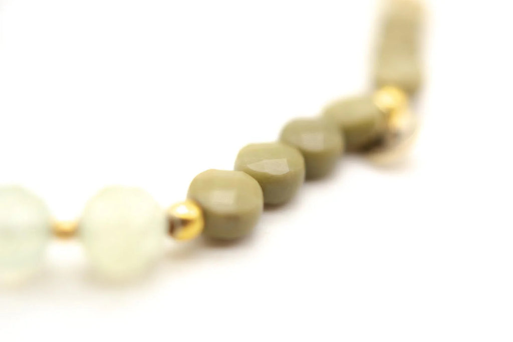 Armband auf Elastikband mit Sterlingsilber vergoldet, Perlen (6mm) aus Prehnit und Jaspis, Prehnit-Anhänger