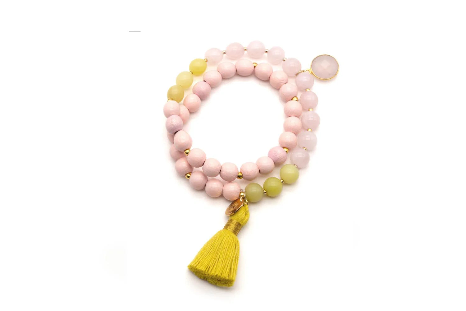Armband doppelt auf Elastikband, Sterlingsilber vergoldet, Holzperlen, Perlen aus Rosenquarz und Jade, Rosenquarz-Anhänger und Quaste