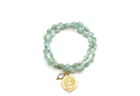 Armband doppelt auf Elastikband, Sterlingsilber vergoldet, Perlen aus Amazonit, Aquamarin-Anhänger und Münze