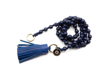 Handykette lang (ca. 120cm Gesamtlänge) aus Nylon geflochten mit Holzperlen, Labradorit-Anhänger, handgefertigter Quaste aus Nappaleder und Logo-Tag aus vergoldetem Messing